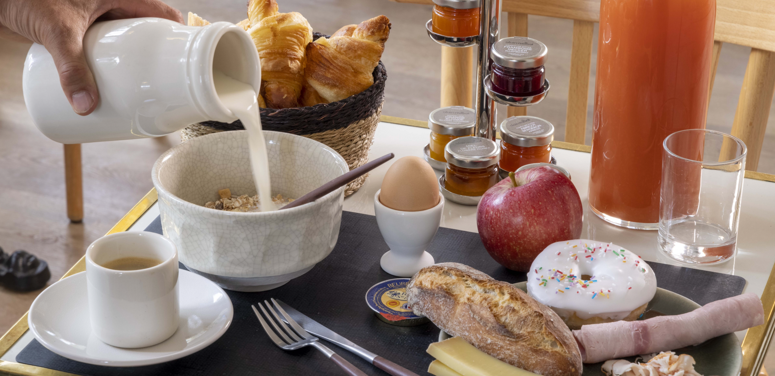 • Access to the hotel breakfast in the form of a buffet — croissants, pains au chocolat, pain aux raisins, coffee, tea, homemade squeezed orange juice, cakes, cereals, pancakes, yogurts, dried fruits, nuts, fruits, cheese, dried fruits, cheese, cheese, charcuterie, charcuterie, scrambled eggs, soft-boiled eggs...Access to the private spa (45 min) — Saltwater and heated “flotarium” pool, Sauna, Relaxation area